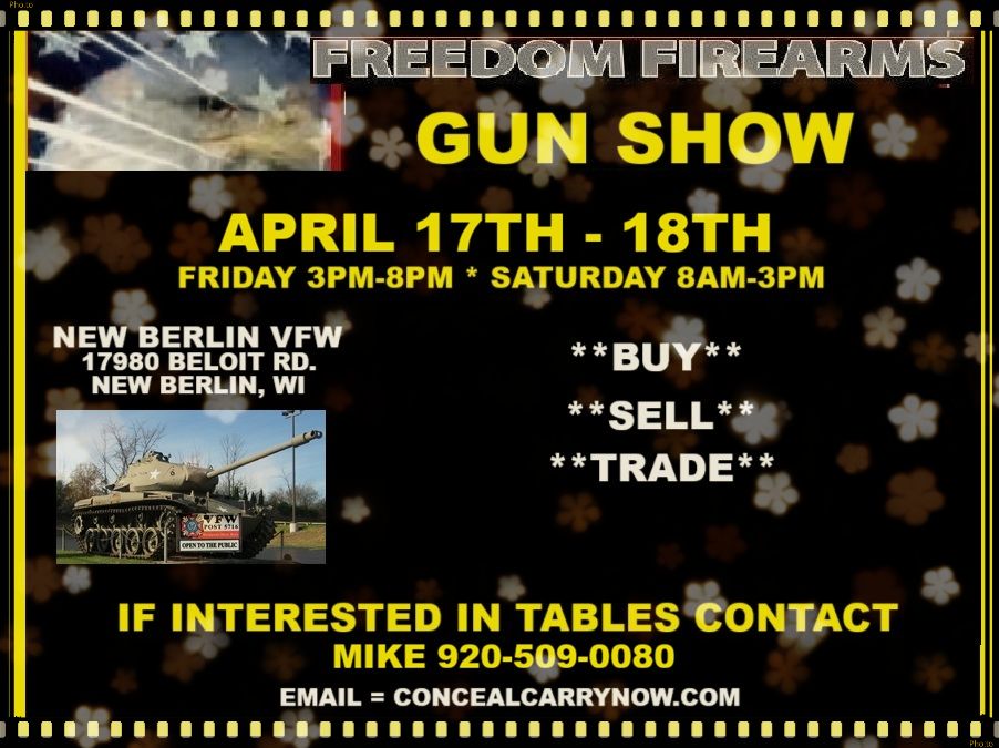 Admission: $8.00, ALL VETERANS ARE FREE Hours: APRIL 17 TH - Friday: 3:00pm - 8:00pm APRIL 18TH - Saturday: 8:00am - 3:00pm Contact: MIKE 920-509-0080 IF INTERESTED IN TABLES WEBSITE …